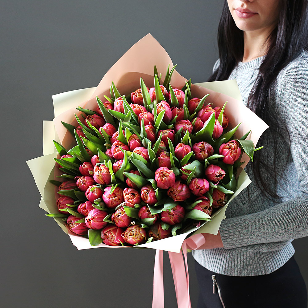 Пионовидные коралловые тюльпаны в стильной упаковке.