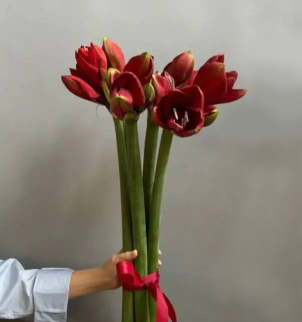 Этот великолепный букет состоит из пяти изящных и эффектных амарилис, которые являются настоящим символом красоты, элегантности и торжественности. Каждая амариллис отличается крупными, пышными цветами с изогнутыми лепестками, раскрывающимися словно в танце, и насыщенными оттенками, от ярко-красного и белого до нежных розовых и пурпурных тонов, создавая яркую и выразительную композицию. В этом букете амариллисы расположены так, чтобы подчеркнуть их богатство и объемность, а их устойчивость и декоративность делают его идеальным для особых случаев, праздников, юбилеев или как эффектный подарок. Зеленая лиственная основа аккуратно дополняет яркие цветы, добавляя свежести и структурности. Этот букет — воплощение роскоши и красоты, он способен украсить любой интерьер, подчеркнуть важность события или просто подарить радость и восхищение.