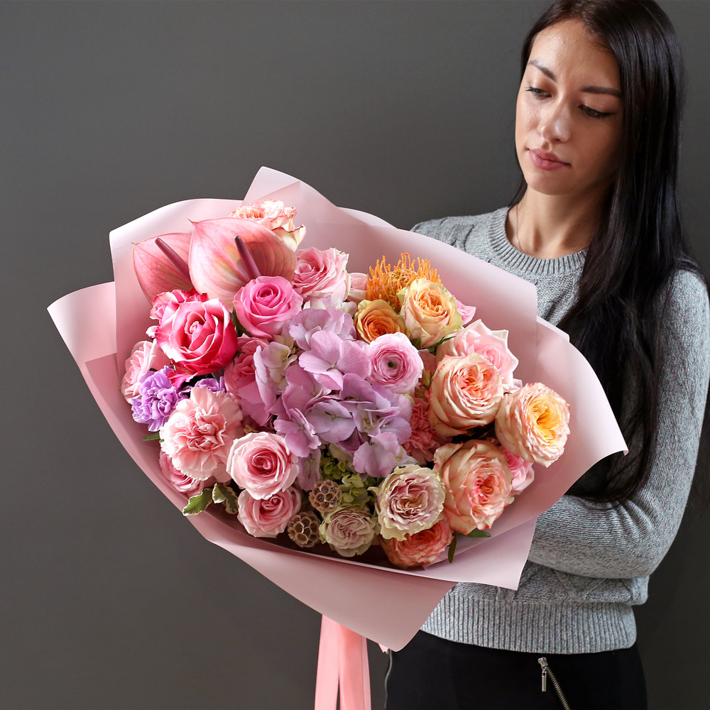 Букет в переливающейся гамме из сиреневой в персиковою. В составе несколько сортов роз, гортензии, антуриумы, диантусы и др.