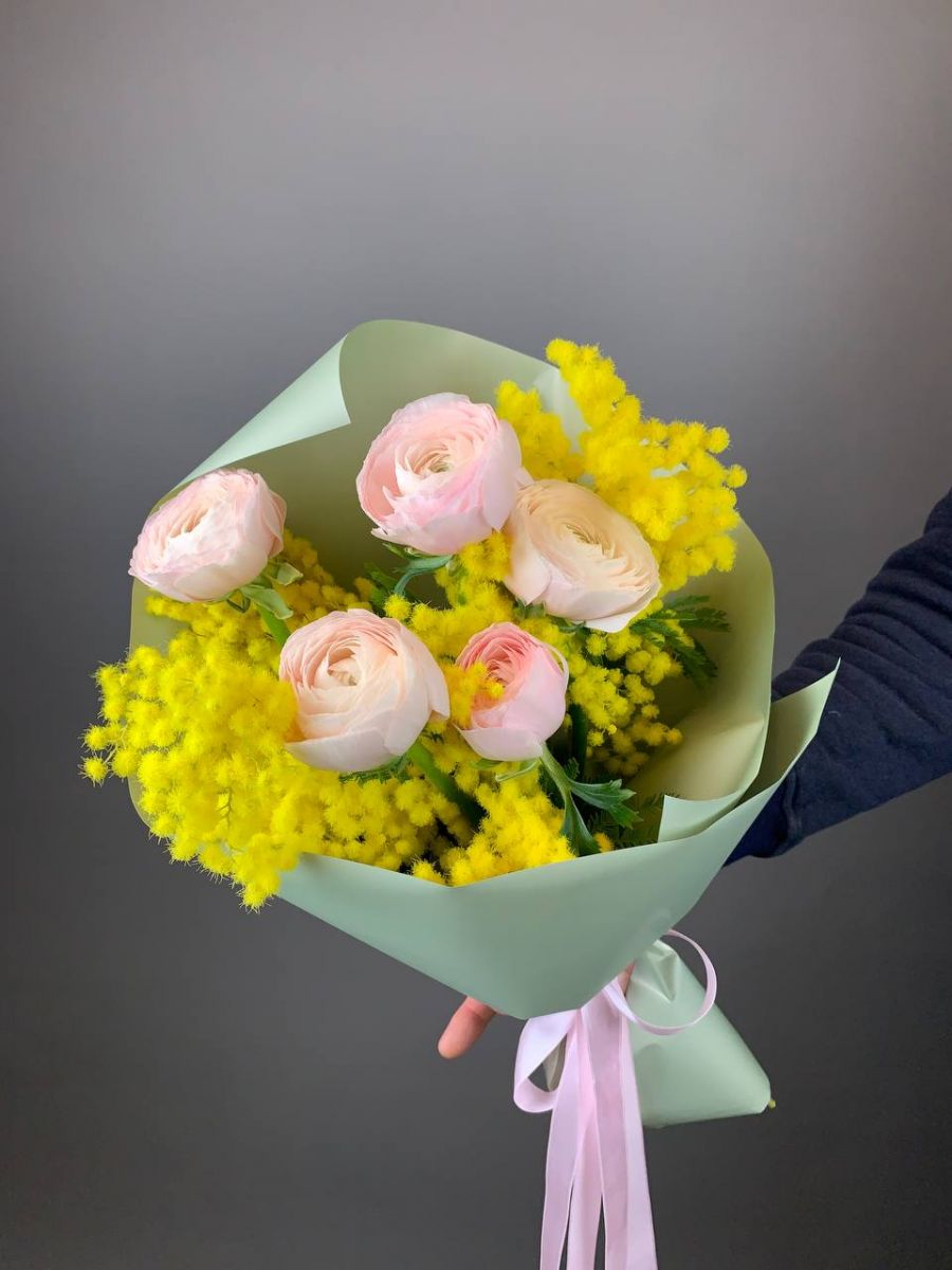 Букет весенней нежности - розово-кремовые ранункулюсыв сочитании с яркой мимозой, упакованы в стильную зеленую упакованы в стильную зеленую бумагу с розовой лентой. Идеальный подарок для весеннего настроения и ярких эмоций.