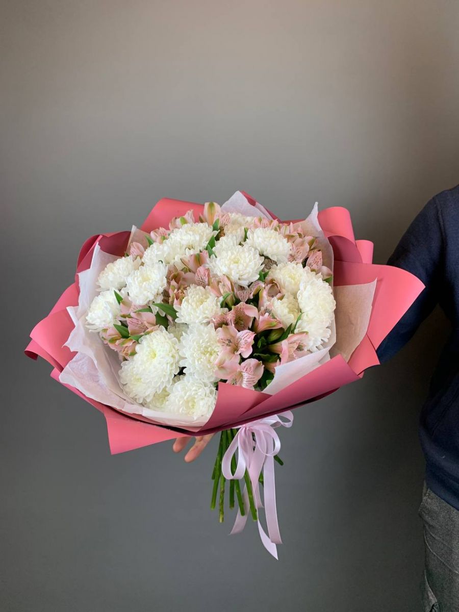 Стильны букет из белых хризантем и нежных альстромерий, оформленный в элегантную упаковку с лентой. Прекрасный выбор для вырожения теплых чувств и создания праздничного настроения.