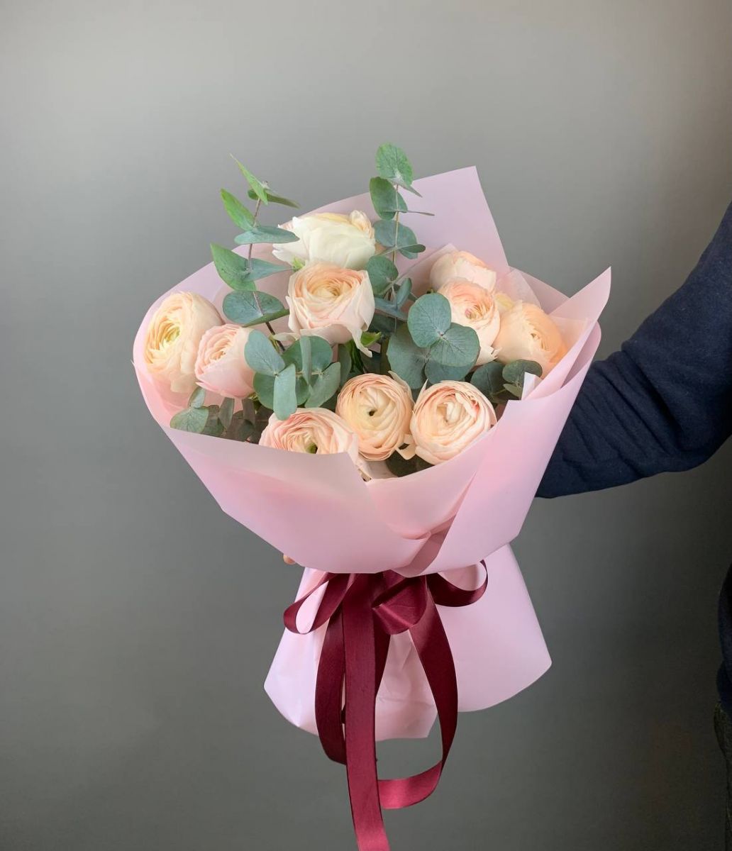 Легкий и изысканный букет в нежных розово-кремовых тонах. Элегантные ранункулюсы, дополненные веточками эвкалипта, создает атмосферу утонченности и теплоты. Упаковка из матовой розовой пленкии бургундская лента придает букету особый шарм. Идеальный подарок для вырожения чувств, поздравления с важным событием или просто чтобы подарить улыбку.