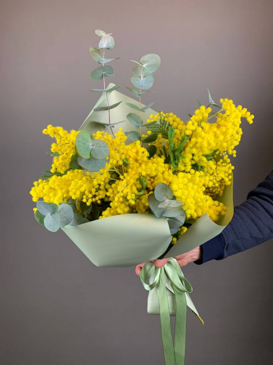 Ярко-желтые цветы мимозы, символизирующие приход весны и тепло, создают радостное настроение. В композицию добавлены веточки эвкалипта, что придает букету свежести и оригинальности.