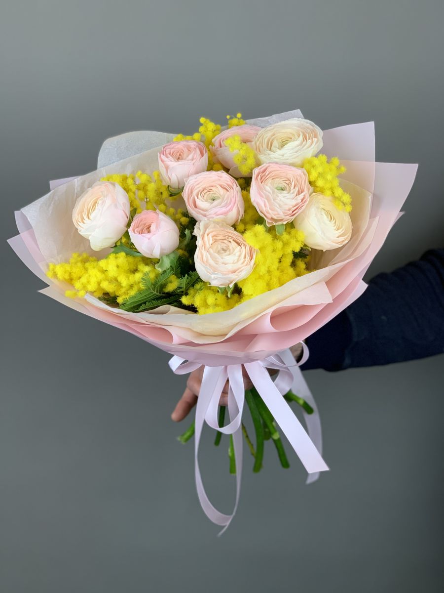 Нежно-розовые лютики с мимозой
