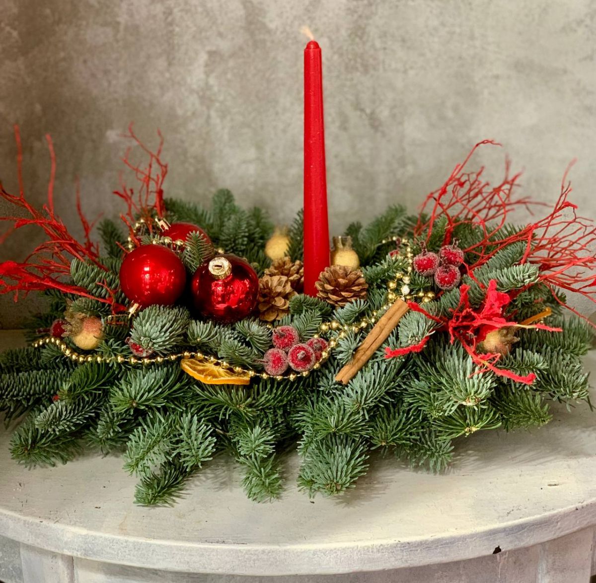 Это праздничное новогоднее украшение, выполненное в виде элегантного композиционного центра. Основа композиции — густая зелень хвойных веточек, создающая ощущение свежести и зимней природы. В центре размещена яркая красная свеча, которая является главным акцентом и символом праздника. Вокруг свечи расположены красные и золотые новогодние украшения, такие как шарики, ягоды и бусины, которые придают композиции яркость и торжественность.