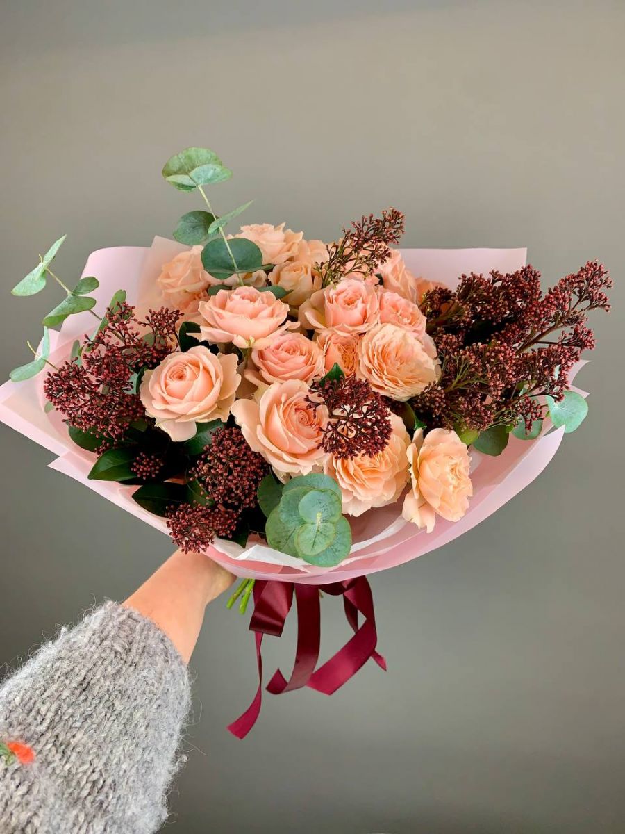 Нежный букет из кустовых роз с эвкалиптом и бордовым акцентом скимией - универсальный вариант для поздравления, благодарности или рамантического сюрприза. Идеален, когда хочется выразить чувства неновязчиво и со вкусом.