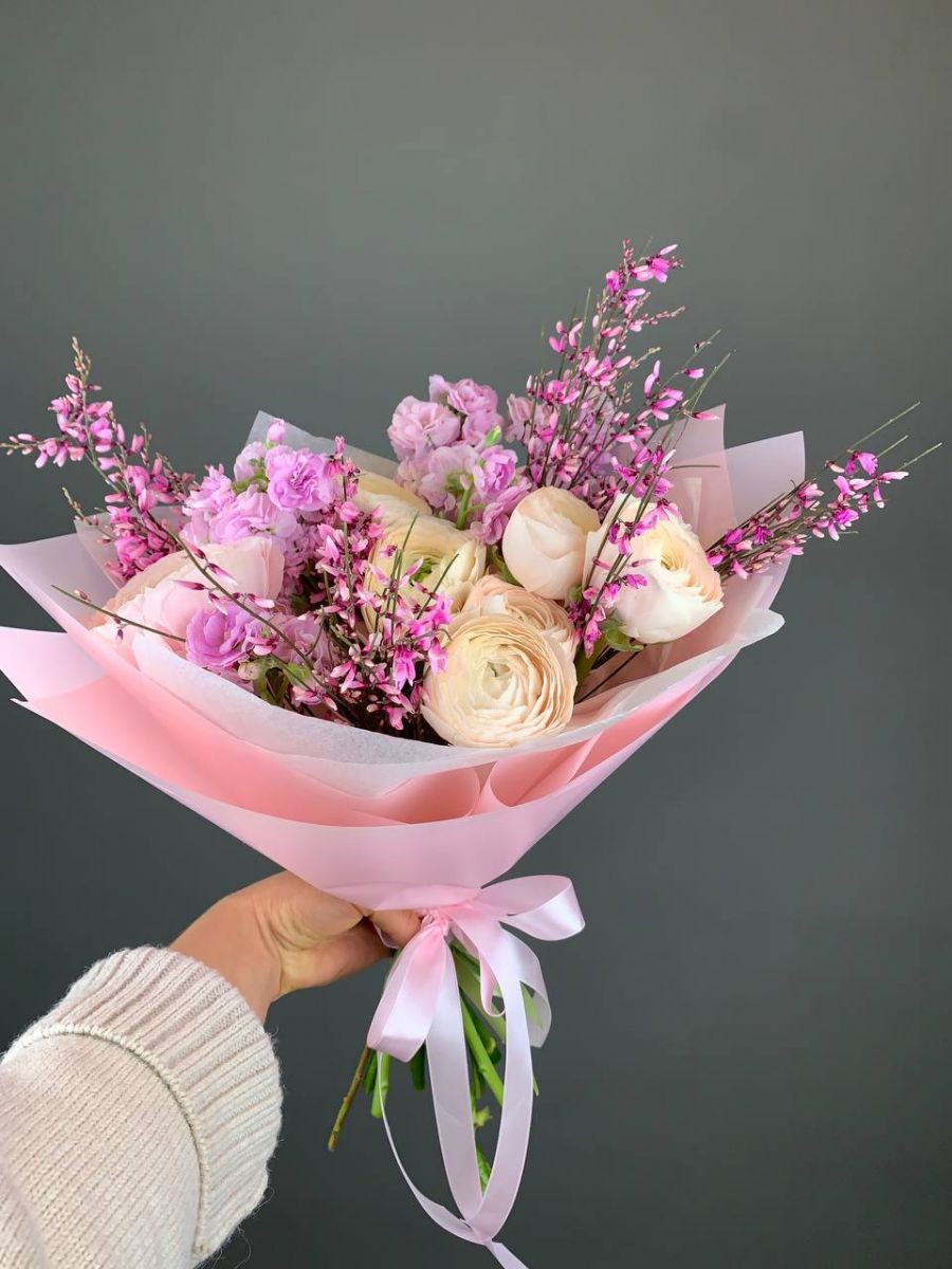 Нежный букет из кремово-розовых ранункулюсов с легкими розовыми веточками генисты - идеальный весенний акцент. Воздушная композиция в розовой дизайнерской бумаге,перевязана отласной лентой. При праветьном уходе сохраняет свежесть в среднем 10 дней. Уневерсален для 8 Марта, дня рождения, признания в любви или просто для поднятия настроения.